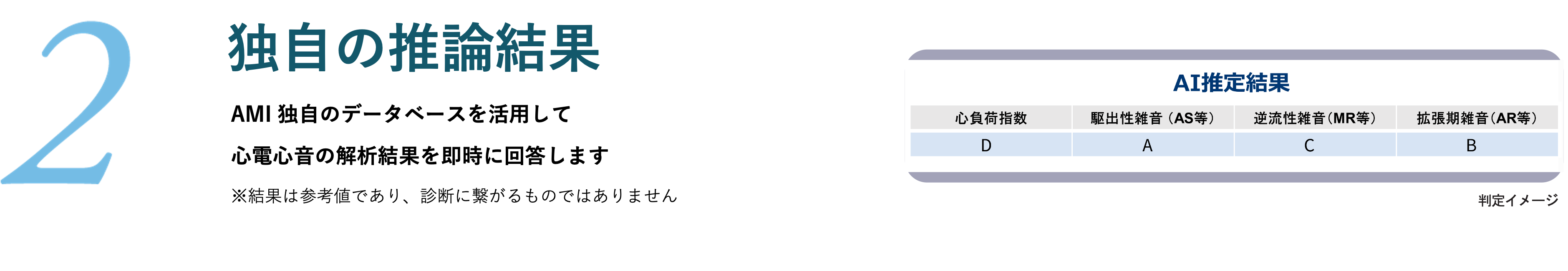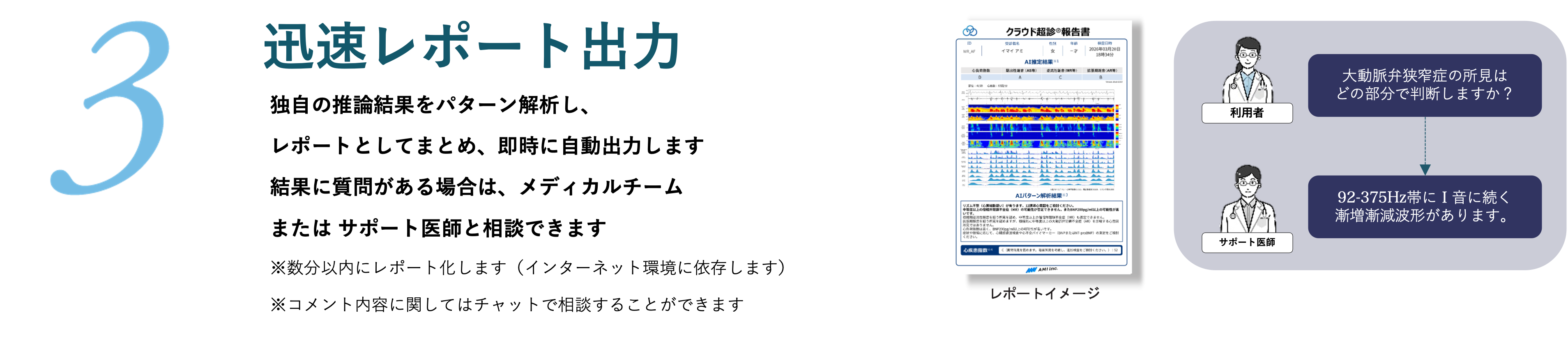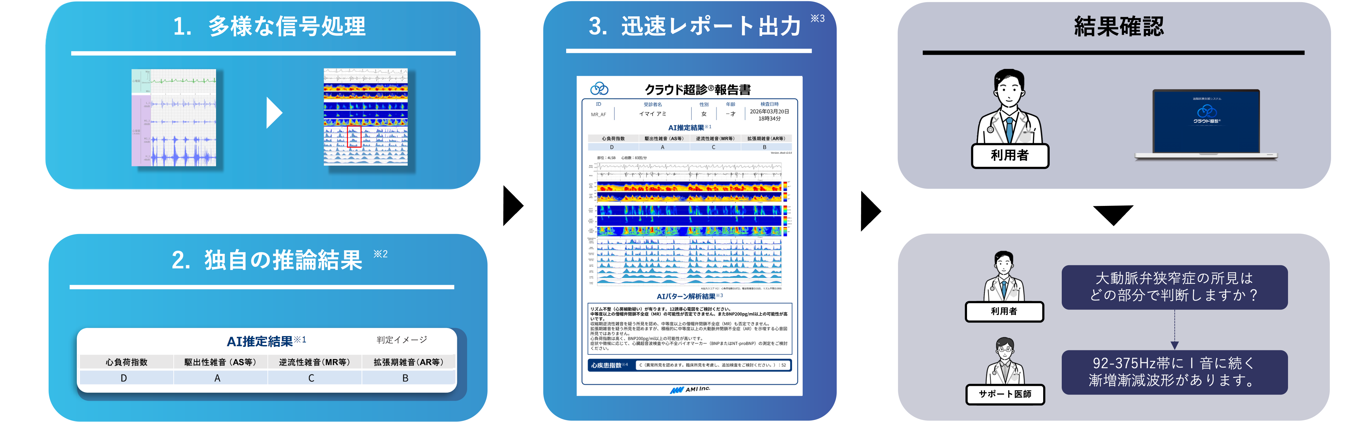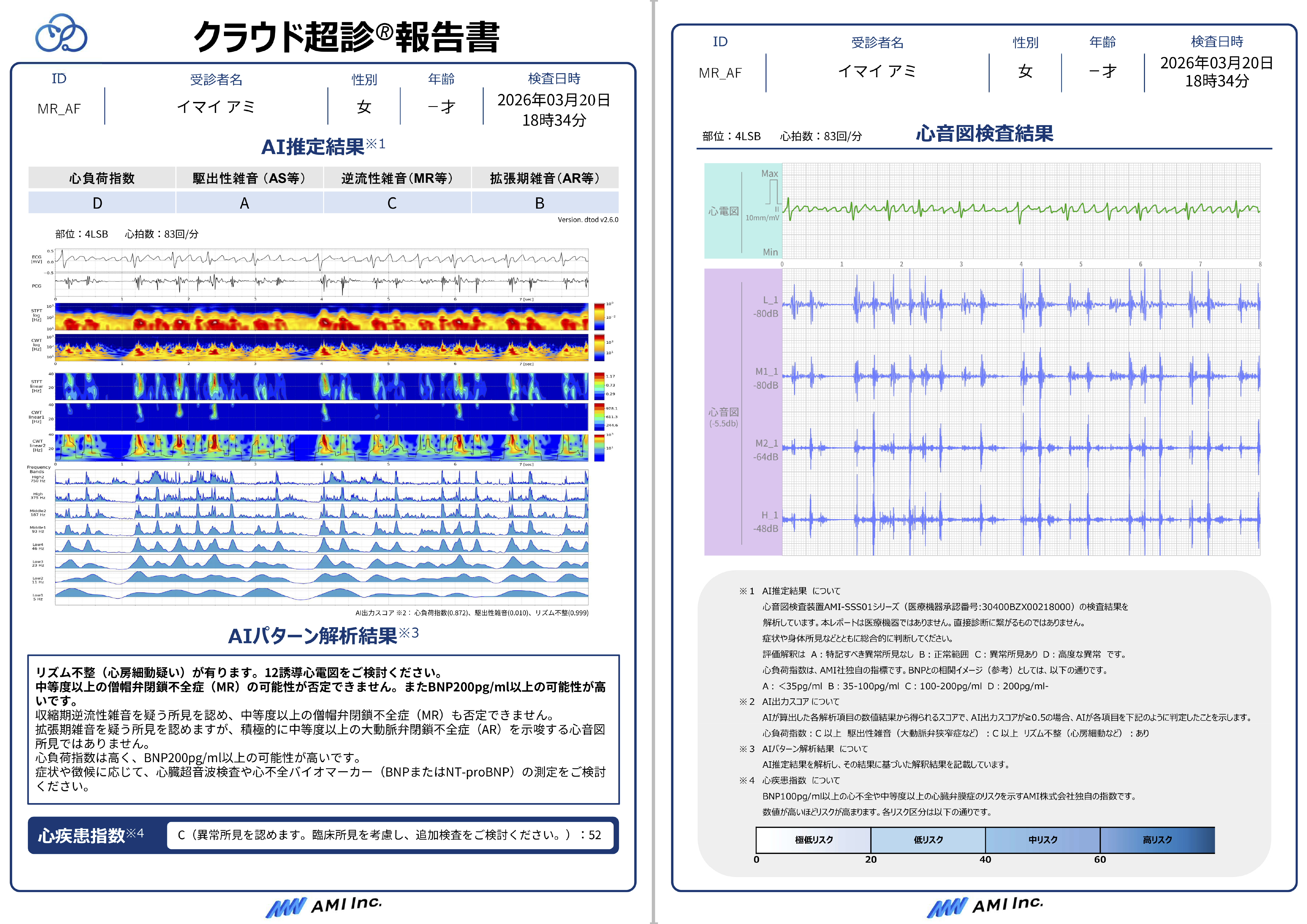 遠隔医療支援システム『クラウド超診®︎』は、『Cardio-EGG(心音図検査装置AMI-SSS01シリーズ)』で取得した心音・心電データをもとに、クラウド上で独自のアルゴリズムにより波形を自動解析し、心負荷や心臓弁膜症などのリスクを推論した結果を即時レポートとして提示する遠隔医療支援サービスです(※非医療機器・業務委託型サービス)。