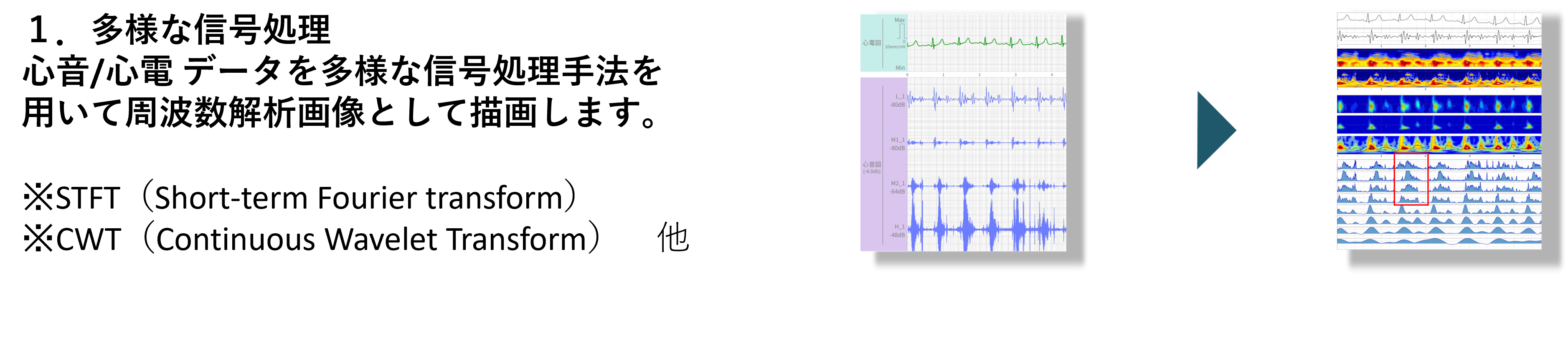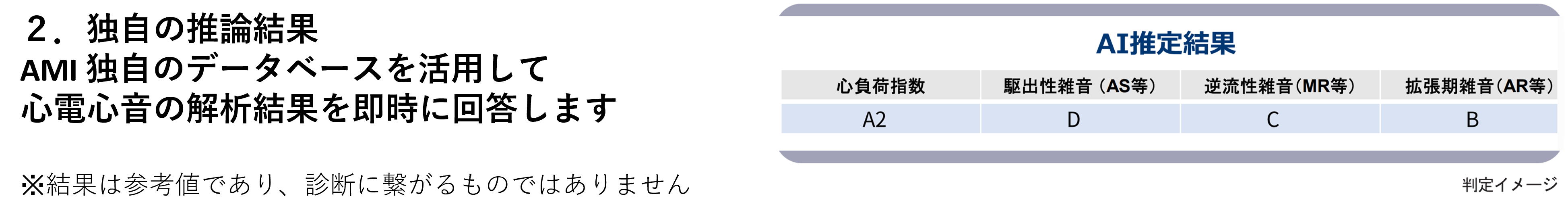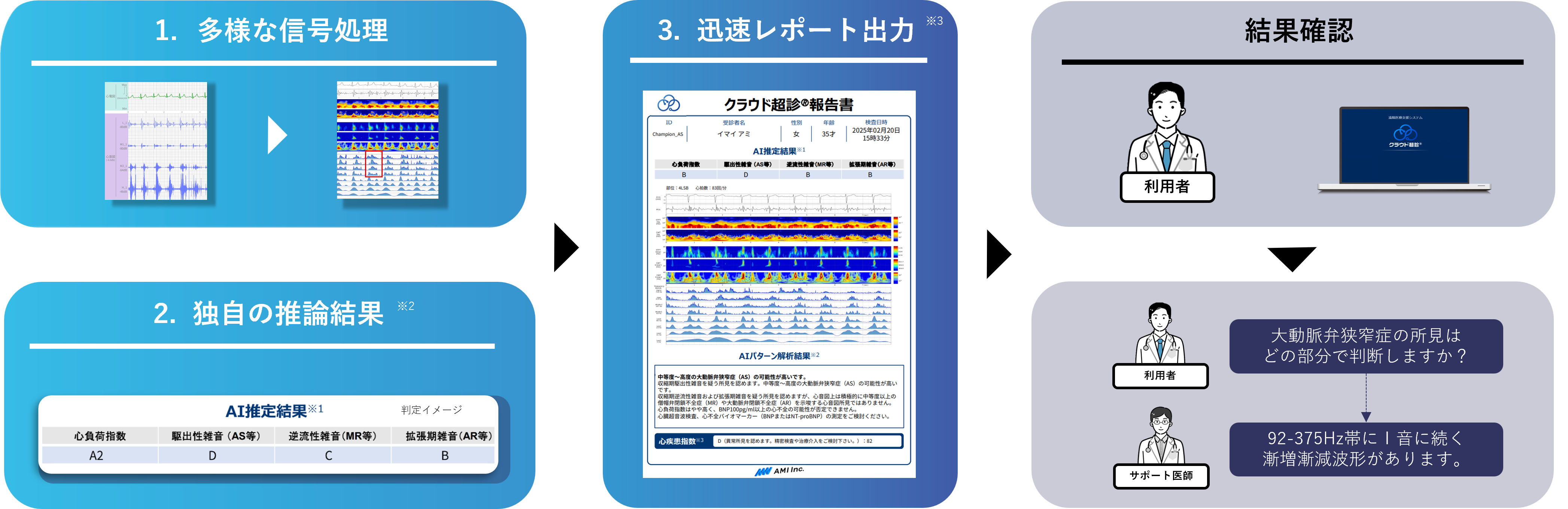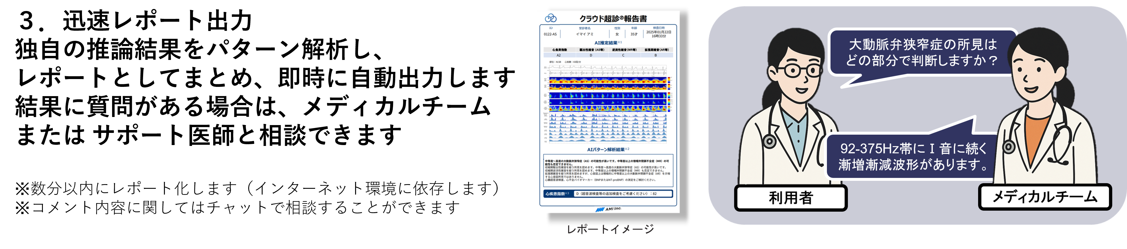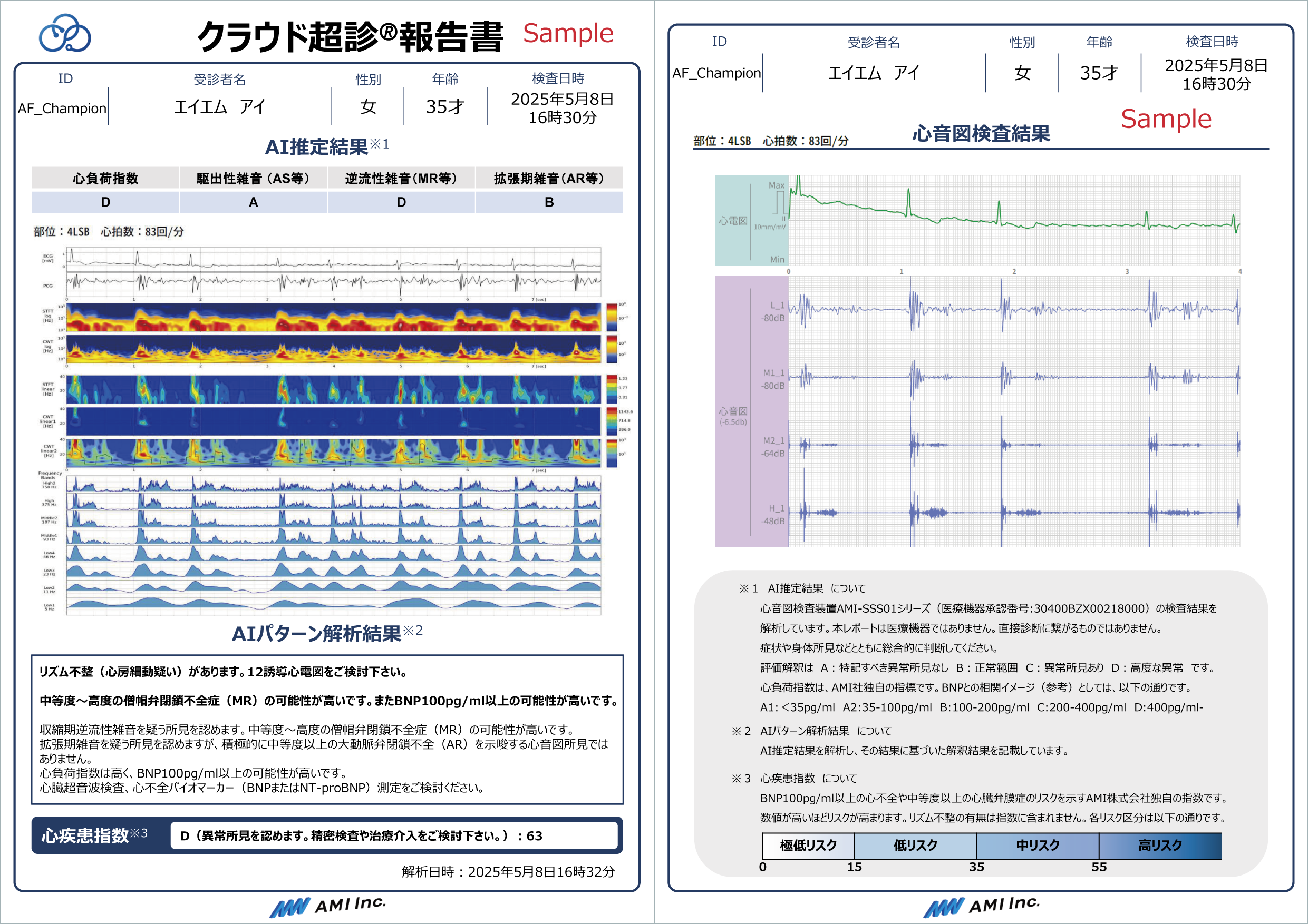遠隔医療支援システム『クラウド超診®︎』は、『心音図検査装置AMI-SSS01シリーズ』で取得した心音・心電データをもとに、クラウド上で独自のアルゴリズムにより波形を自動解析し、心負荷や心臓弁膜症などのリスクを推論した結果を即時レポートとして提示する遠隔医療支援サービスです(※非医療機器・業務委託型サービス)。