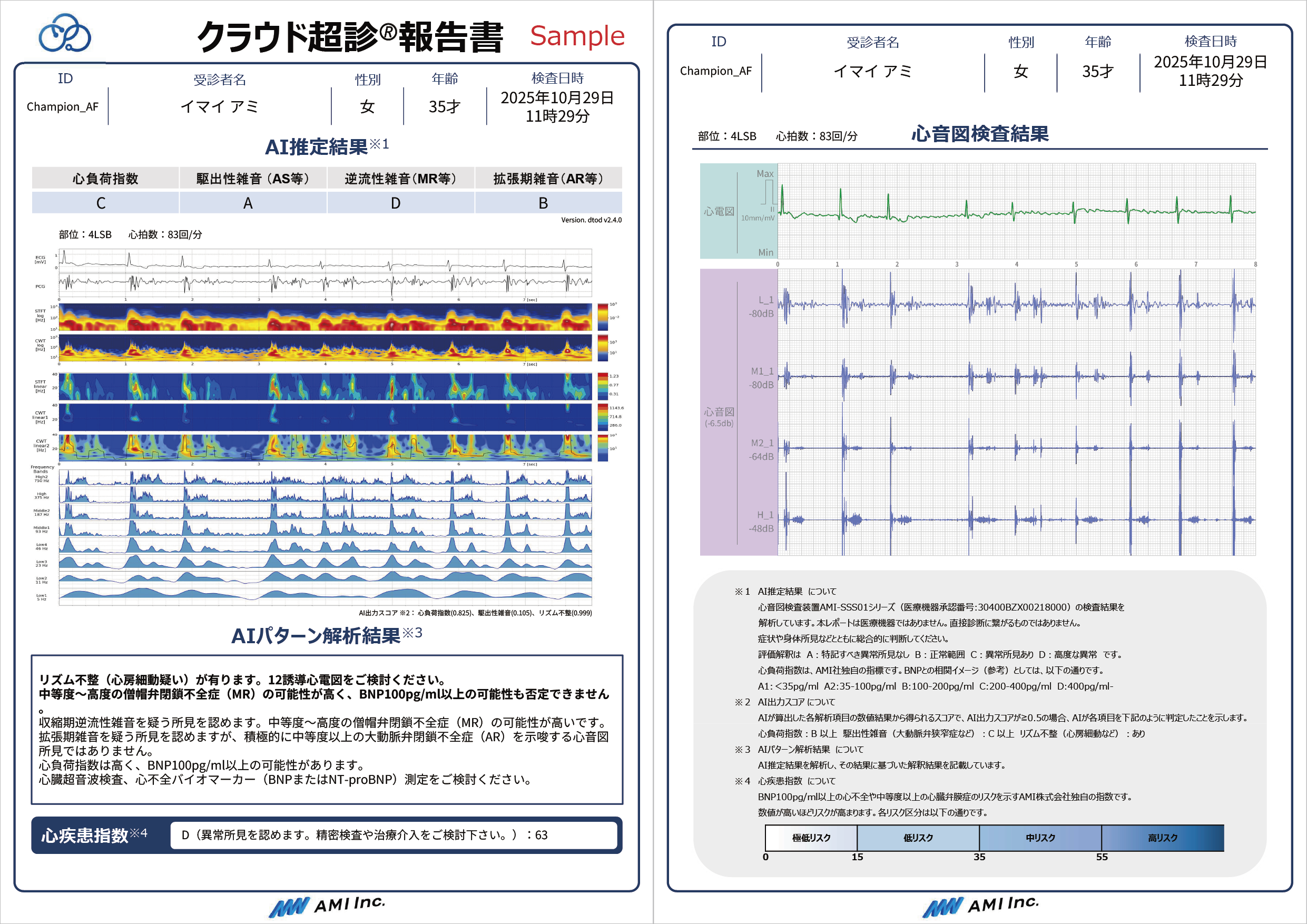遠隔医療支援システム『クラウド超診®︎』は、『Cardio-EGG(心音図検査装置AMI-SSS01シリーズ)』で取得した心音・心電データをもとに、クラウド上で独自のアルゴリズムにより波形を自動解析し、心負荷や心臓弁膜症などのリスクを推論した結果を即時レポートとして提示する遠隔医療支援サービスです(※非医療機器・業務委託型サービス)。